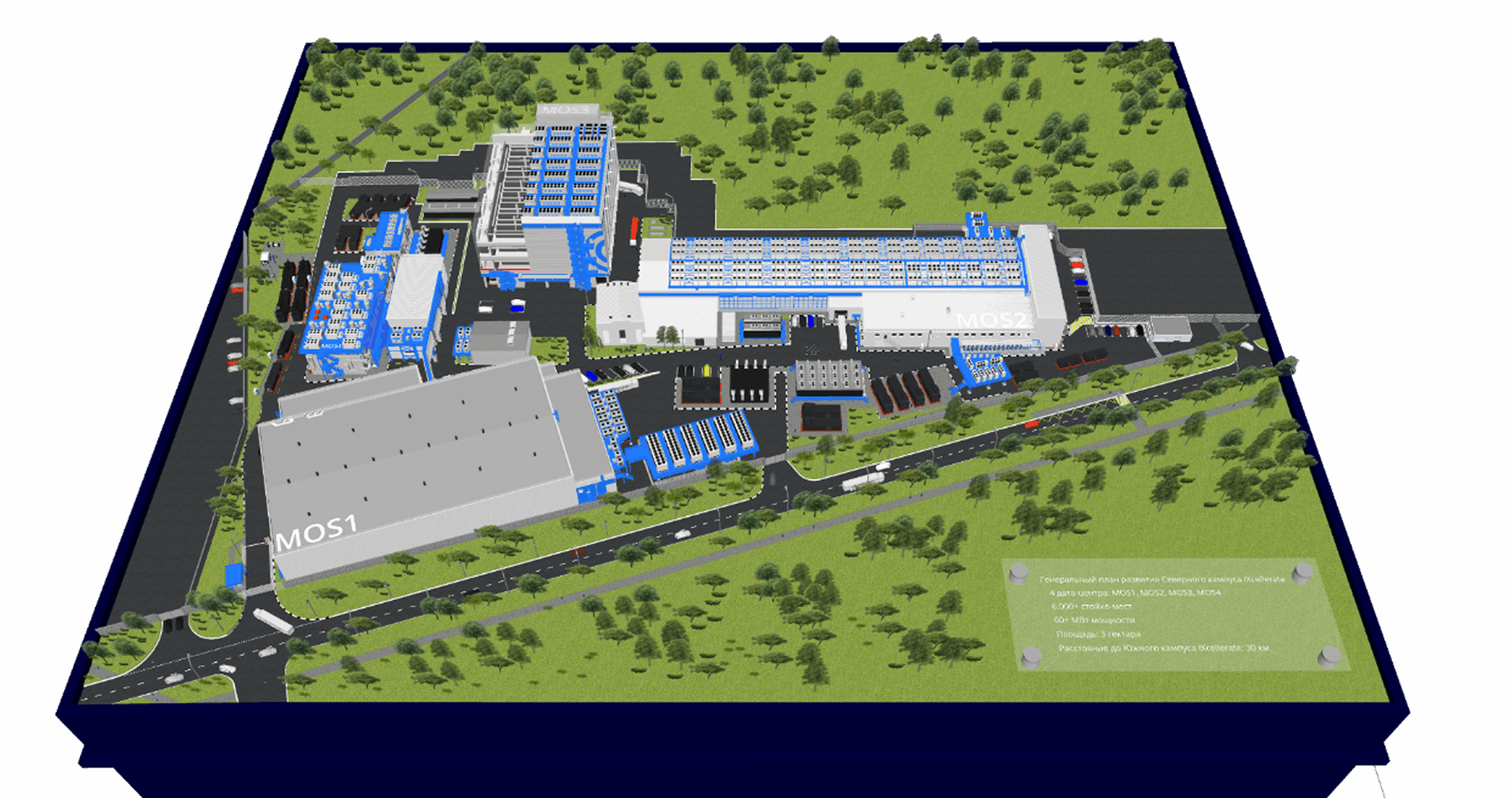 Moscow One (MOS1) – ЦОД уровня Tier III/Level 3 с тремя машинными залами площадью 6 000 м² для размещения 1 835 стоек с общей мощностью 13,7 МВт.